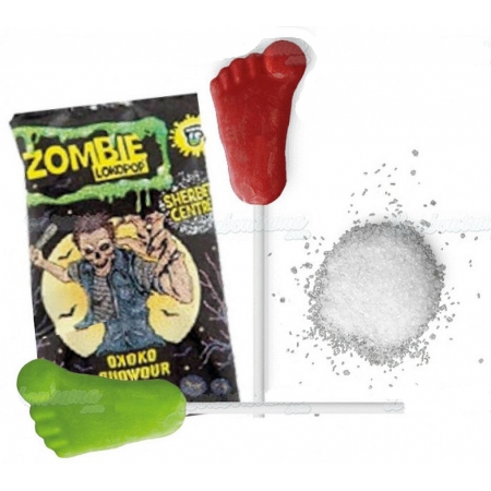 La sucette Pied Poudre Zombie est l'animation parfaite pour colorer les langues et amuser petits et grands lors de vos événements ! Ce sachet contient une sucette en forme de pieds et de la poudre effervescente acidulée pour une expérience gustative unique. Sans gélatine, elle convient à tous les publics en quête de sensations fortes.