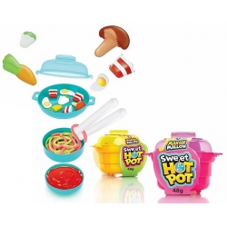 Faitout à étage contenant tous les ingrédients d’une fondue chinoise, des nouilles marshmallow, des baguettes chinoises en dextrose, de la sauce en bonbon liquide et des condiments en bonbons gélifiés . Parfum : Multifruits.