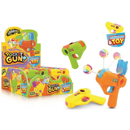 Pistolet contenant une sucette multicolor au goût fruité - plusieurs couleurs de pistolets disponible (orange et bleu, jaune et violet, vert et orange)