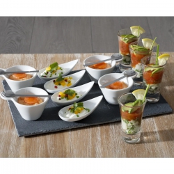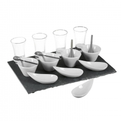 Détail dimensions: Plateau : L. 32cm ; l. 22cm Cuillères : 10cm Verrines : d. 5cm ; h. 9cm Coupelle : L.