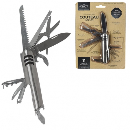 1.5x2.7x9.4cm - Contient : ouvre-boîte, scie à bois, écailleur à poissons avec dégorgeoir, décapsuleur avec
