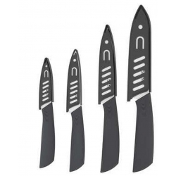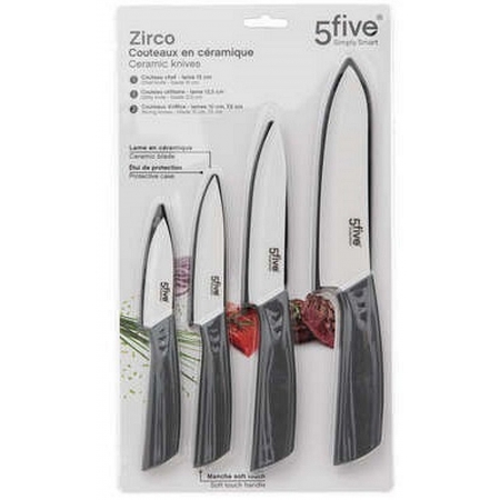 Lot incluant 4 couteaux : - Chef 15 - Utilitaire 12,5 - Office 10 - Office 7,5 Lames en céramique pour un tranchant efficace Etuis de protections inclus Revêtement rubber sur les manches pour plus de confort et une meilleure prise en main