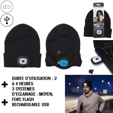 Ce bonnet esthétique a une particularité : il est doté de LED rechargeables USB ! - Durée d’utilisation : 2 à 4 heures - 3 systèmes d’éclairage : moyen. fort. flash - Rechargeable USB - Composition principale : acrylique