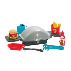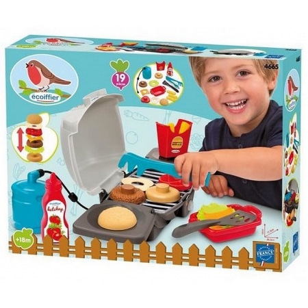 Barbecue a gaz comprenant de quoi faire cuire un hamburger, des frites, du ketchup, un plat, une spatule,