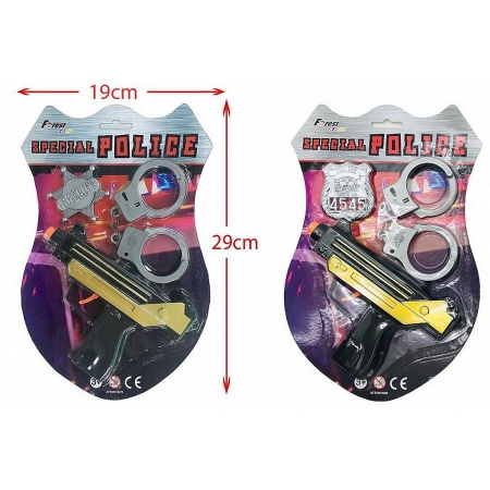 Blister comprenant un pistolet, une paire de menottes et une insigne.