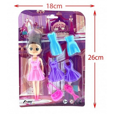 Blister comprenant 1 poupée, 4 robes et des accessoires de beauté.